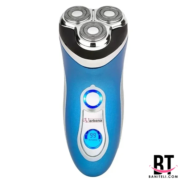 ریشتراش وربنا مدل VR-1852 با طراحی سه تیغه چرخشی ساخته شده و ظاهر دستگاه کاملاً ارگونومیک است تا هنگام اصلاح دست خسته نشود. بدنه با ترکیب رنگ آبی و نقرهای طراحی شده و بهگونهای شکل داده شده که در دست از سر نمیخورد. دکمه روشن و خاموش روی بدنه قرار دارد و نمایشگر دیجیتال زیر آن میزان شارژ باقیمانده را بهصورت عددی نشان میدهد. سه تیغه در بالای دستگاه در یک قاب گرد قرار گرفتهاند و قاب تیغه به صورت شناور حرکت میکند تا روی انحناهای صورت بهتر بنشیند.